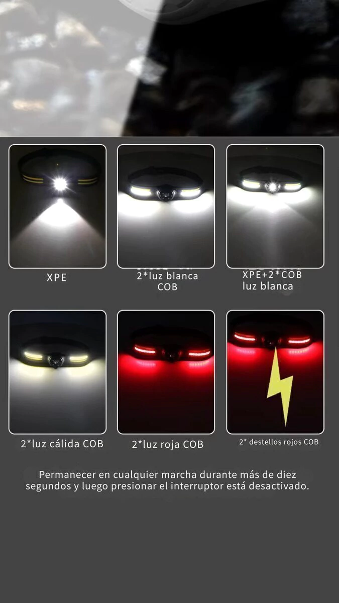 Características técnicas destacadas: - Lámparas: XPE + 4*COB (luz blanca, luz cálida y luz roja) - Alcance de iluminación: 50-100 metros - Batería recargable de 700 mA con carga USB tipo C - Tiempo de uso continuo: hasta 3 horas - Peso liviano: 85 gramos, ideal para llevar cómodamente