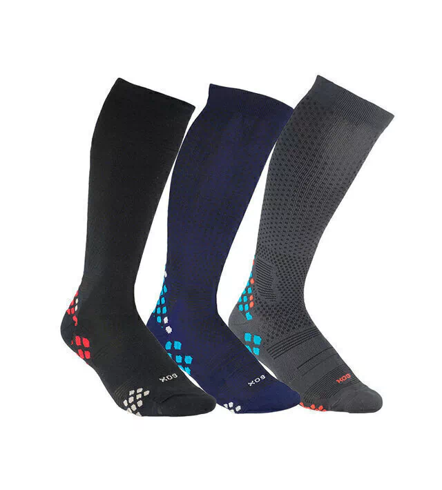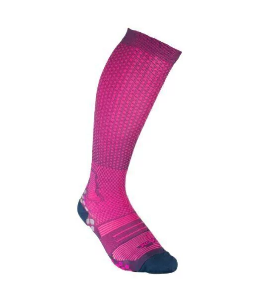Medias de compresión graduada pensadas para el deportista. Desarrolladas para contribuir a la re-circulación del sistema sanguíneo y a la contención de los músculos. Colaboran en la prevención de la fascitis plantar por la compresión transmetatarsal. Caña con punto de tejido especialmente diseñado para lograr una mejor ventilación de la pierna, caña y pie anatómicos, sectores específicos de ventilación para evitar el calentamiento del pie, puntos de apoyo sectorizados con mayor densidad para absorber impactos. Puño doble. Talón y puntera reforzados, costura de puntera extra plana. Secado rápido gracias a su composición.
